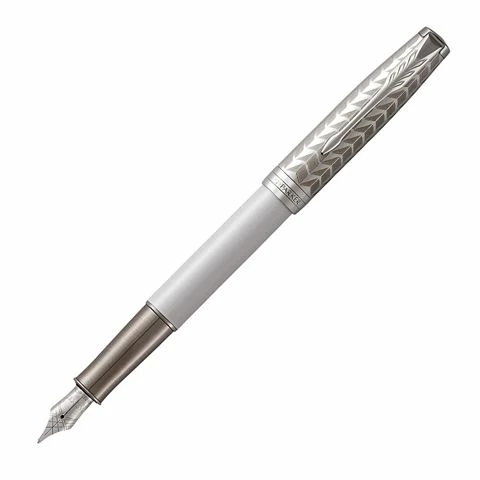 This attractive Pearl variant feels smooth in the hand, and glistens with a finely etched cap and a silver-plated ring cap. A polished grip is accompanied by an eighteen karat solid gold nib covered with a rhodium finish, making for an exclusive-looking and -feeling fountain pen.